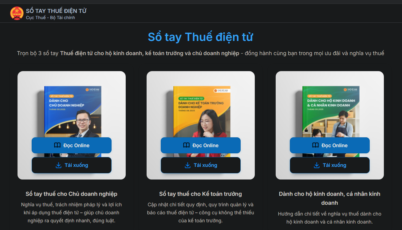 Chuyên mục “Sổ tay thuế điện tử” bao gồm: Sổ tay thuế cho Chủ doanh nghiệp, Sổ tay thuế cho Kế toán trưởng và Sổ tay Dành cho hộ kinh doanh, cá nhân kinh doanh. Nội dung các chuyên mục được đăng tải tại địa chỉ: https://hotronnt.gdt.gov.vn/so-tay-thue-dien-tu/